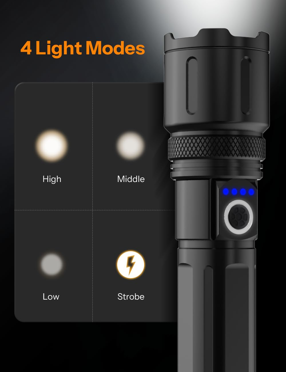 - [Adjustable Focus & 4 Lighting Modes] The smooth zoom function allows you to easily adjust the beam from a wide floodlight to a focused spotlight. Choose from four lighting modes—High, Medium, Low, and SOS. Long-press the power button to turn off the flashlight directly.