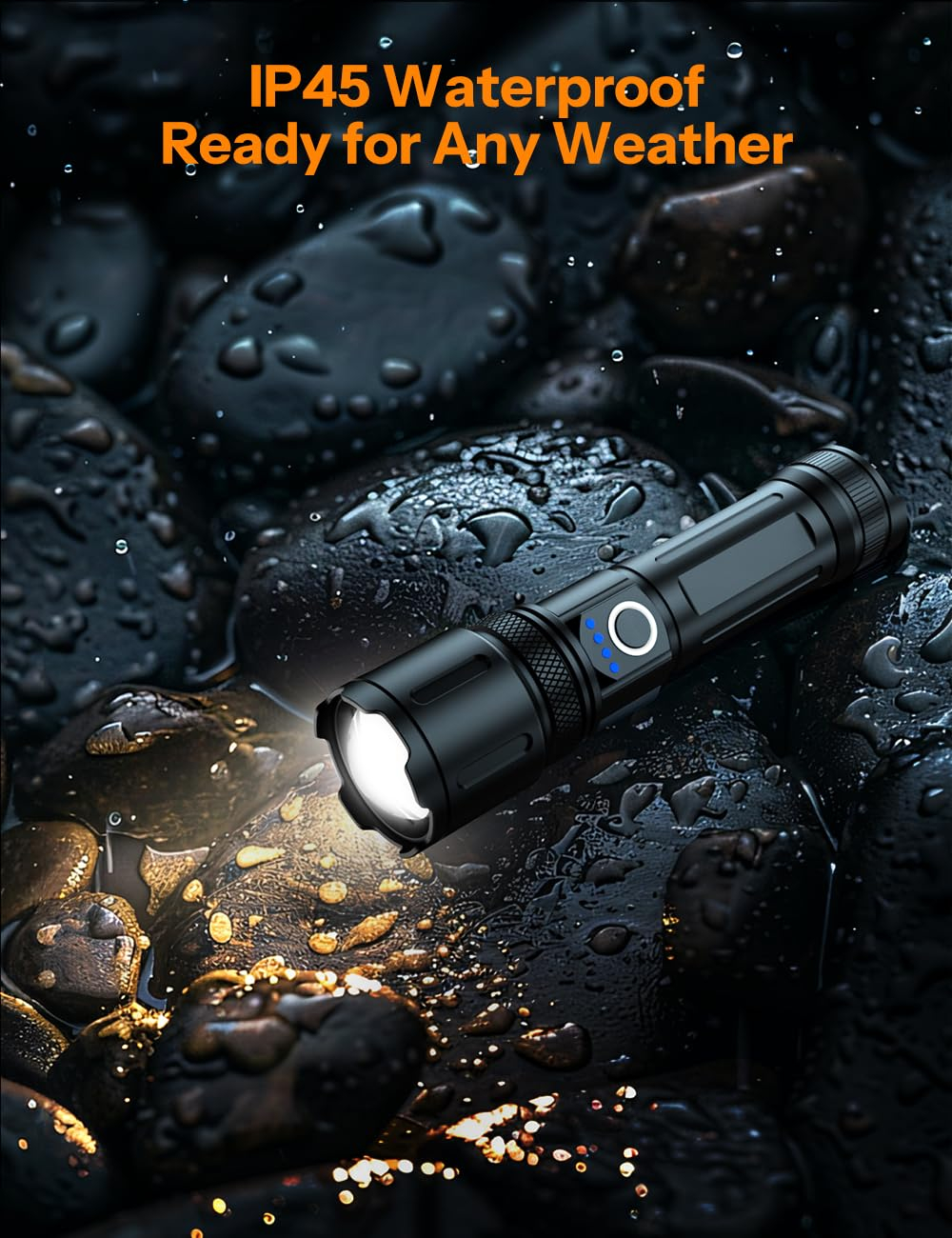 - [Durable & Reliable] Built with aerospace-grade aluminum alloy and rated IP45 for water resistance, this flashlight is waterproof, shockproof, and crush-resistant—ready to withstand rain, snow, and harsh conditions. Comes with a high-definition lens, anti-slip grip, wrist strap, and easy-press switch for convenient operation.